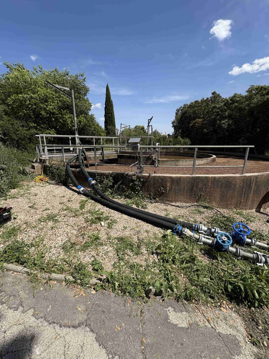 En 2025, à la station d'épuration de Poulx-et-Redessan (Languedoc-Roussillon - Occitanie), une opération complexe de renouvellement des ponts racleurs a nécessité la mise en place d'une solution de pompage et de gestion de flux sur mesure.